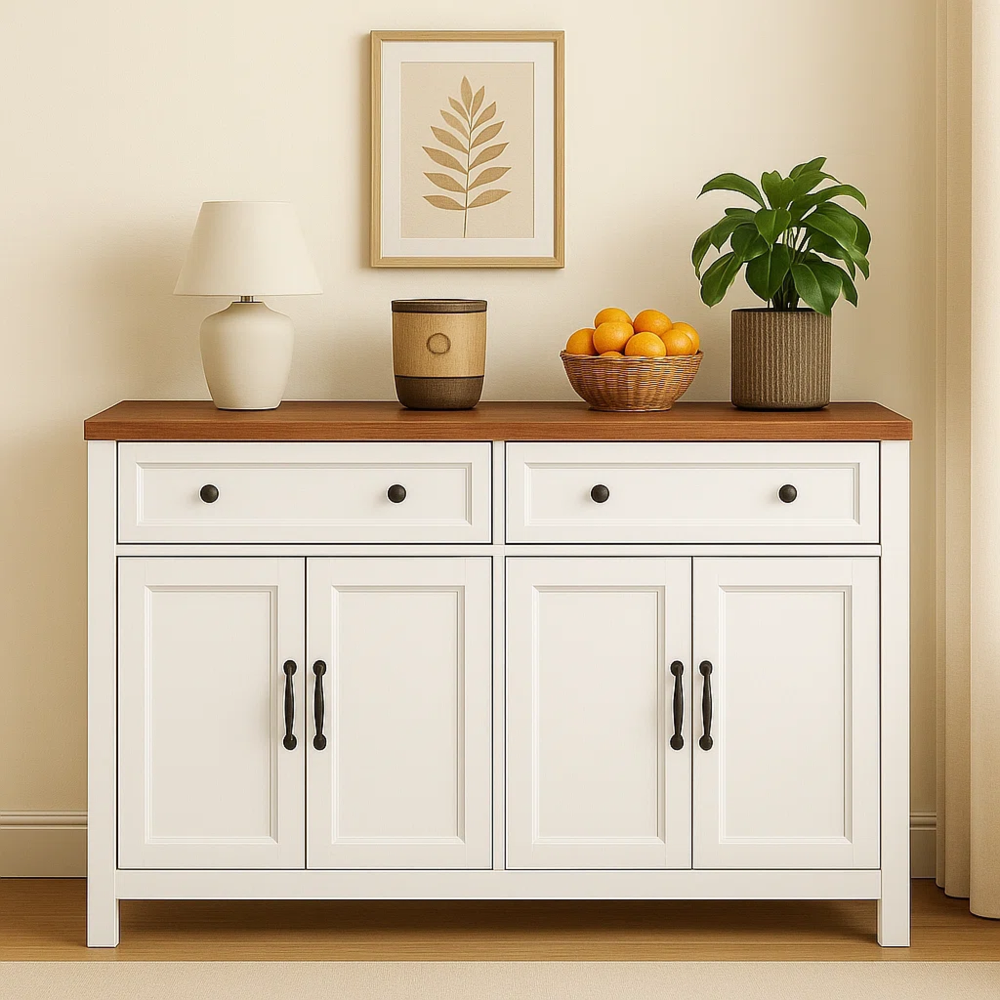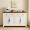This 55.1-inch wide farmhouse-style sideboard brings a warm, inviting feel to your kitchen, dining room, or living area. Designed with practicality and style in mind, it features three smooth-gliding drawers and four cabinet doors that open to adjustable shelves—perfect for storing dinnerware, glassware, small appliances, and more. Made from durable engineered wood, this buffet cabinet offers a spacious top surface for serving or displaying decor. Its clean lines, recessed panel doors, and mixed-color finish effortlessly complement both rustic and modern interiors. All parts are precisely machined and clearly labeled to ensure a frustration-free assembly experience. Enhanced multi-layer packaging reduces shipping damage, so your cabinet arrives in excellent condition. Whether used as a kitchen buffet, coffee bar, or entryway organizer, this cabinet provides versatile storage with timeless charm.