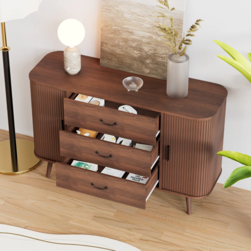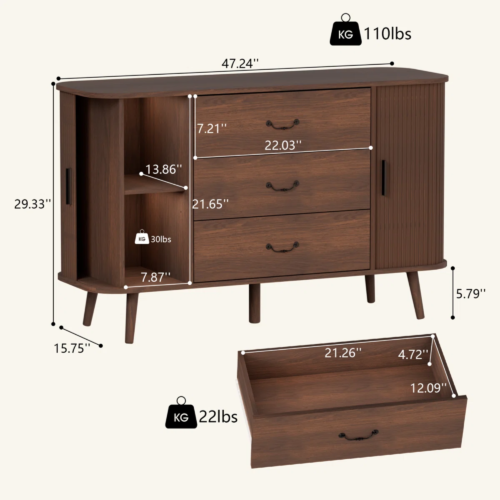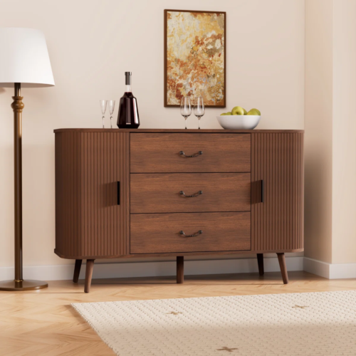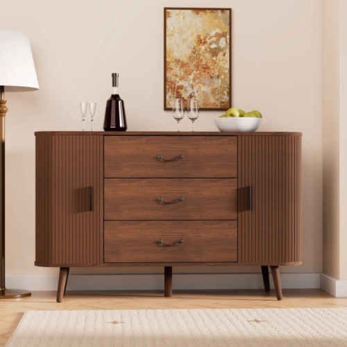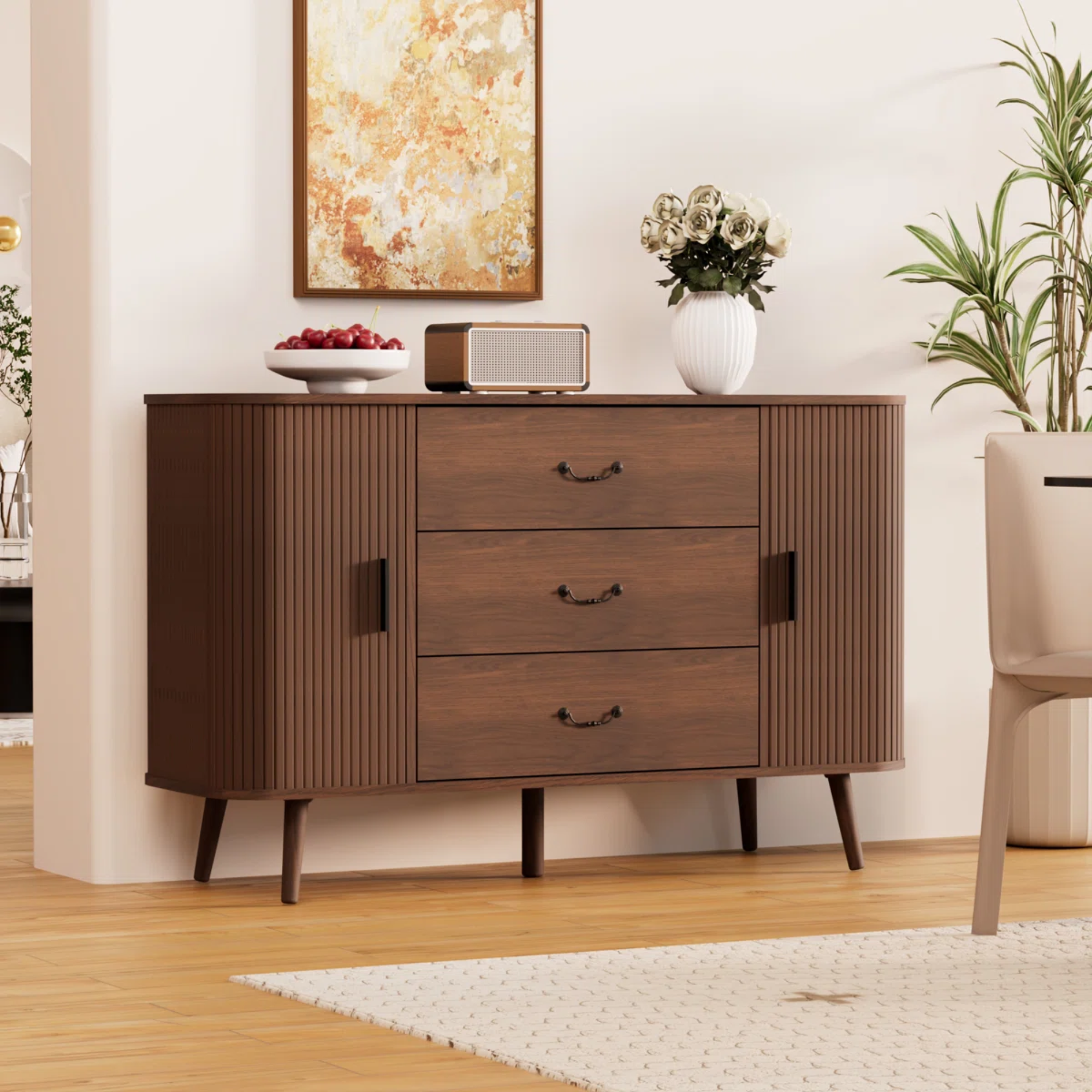 Introducing Our Newly Designed Sideboard!Smooth-gliding dual doors and three spacious drawers deliver ample storage for everyday needs.A classic walnut finish hints at retro charm, while gentle curves prevent accidental bumps.Solid wood legs meet sturdy metal handles – built to last through years of use.Enhanced stability comes from our exclusive bottom support bar, ensuring virtually wobble-free performance during day-to-day use.