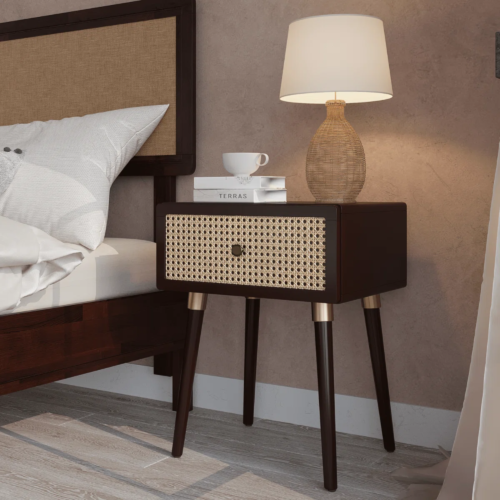 Utilize this Anspach Solid Wood Nightstand to adorn your bedroom! Anspach Nightstand combines modern and traditional styles to create a comfortable yet luxurious atmosphere! The front of the drawer features a distinctive rattan pattern and a unique metal pull handle. This Anspach Nipe solid wood rattan nightstand has a large compartment with plenty of space to store items to help keep your room tidy. A drawer provides hidden storage for bedside necessities like books, reading glasses, and remote controls. The brass knob adds a trendy touch, making it ideal for your bedroom. Furthermore, the top surface is an excellent spot for displaying a small lamp, potted plant, or picture frame. Anspach Nipe walnut nightstand is well-matching in many styles: Rustic End Table, Mid-Century Side Table, Modern Accent Table, Mid-Century Modern Nightstand, Coastal Bedside Cabinet, and Boho Bedside Table. Its smooth surface is simple to clean with a soft damp cloth. It is made of full solid wood, durable and sturdy. In addition, four wooden tapered legs provide overall stability and durability. Distributed load: 99 pounds. Quick assembly, in just 2 minutes: This rattan nightstand is easy to install with 95% complete, just put the legs in and go. Hardware is included for hassle-free assembly. Follow the instructions, and you can assemble it in just a few steps. Inner Drawer dimensions: 14.6 inches W x 10.9 inches D x 3.7 inches H. Walnut nightstand overall dimension: 18.0 inches W x 15.0 inches D x 23.6 inches H. Color: Walnut.