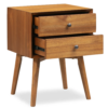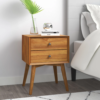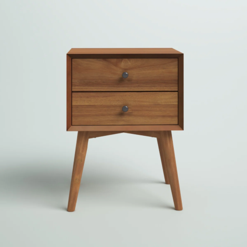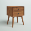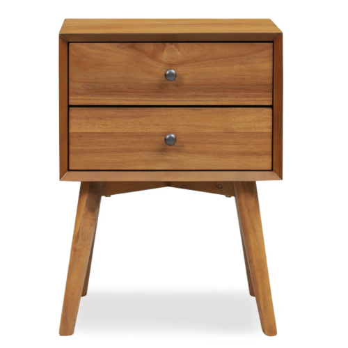 This 2-drawer nightstand brings a simple modern style to your bedroom, living room, or home office. We love that this versatile piece also works as an end table or even as a printer table. It’s made of engineered wood with canted solid wood legs. This table’s light brown finish highlights its natural wood grain color variation. Two drawers offer plenty of room for bedtime essentials, remote controls, or office supplies. Sleek metalic-tone hardware completes the look. Plus, this nightstand’s 17.5” wide and 15” deep top is just right for a lamp and your favorite decorative items.