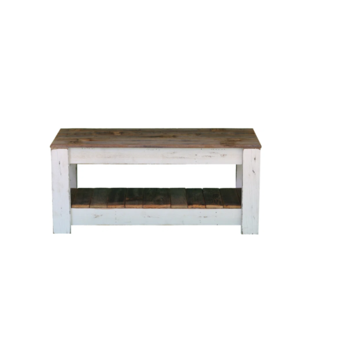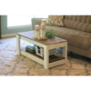 This image shows a rustic-style coffee table placed in a cozy living room setting. The table has a sturdy rectangular shape, featuring a two-tone finish: the tabletop and lower shelf are made from natural wood planks, while the frame and structural elements are painted in a distressed white, giving it a charming, weathered appearance.