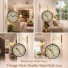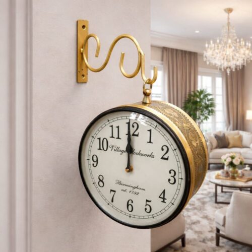 Elegant double-sided wall clock inspired by antique railway station style, allowing time viewing from both sides.