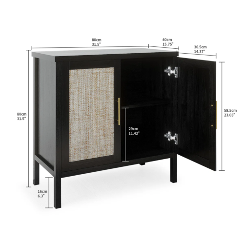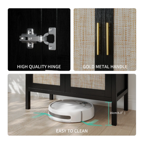 Introducing the ultimate sideboard, an unparalleled combination of simplicity, functionality, and pure beauty that will revolutionize your living space. Immerse yourself in the freedom this product offers as its minimalist design blends seamlessly into any room, be it the kitchen, bedroom, dining room, or living room. Utilize your countertop as a captivating stage, where elegant decorations and refined table lamps harmoniously intertwine, heightening the allure of your surroundings. Unleash its hidden potential by utilizing its cabinets to store a range of spices, dishes, and even those big kitchen utensils, ensuring that your every basic need is met to the fullest. The meticulously crafted metal bar handles, add a sophisticated elegance that will capture the attention of you and your distinguished guests. Check out this door, carefully handcrafted from stunning rattan, perfectly blending sophistication and charm into your precious home decor. Enjoy cleaning with specially reserved cabinet bottoms so your trusty robot vacuum can easily glide through and remove dust from every nook and cranny. The magnetic design ensures a seamless and secure closure, giving you a feeling of ease and assurance. Furthermore, to suit the needs of the various items you own, this extraordinary sideboard comes with adjustable dividers, giving you the freedom to customize the height of the top and bottom compartments to your liking, ensuring optimal storage efficiency. Experience the glamor of bohemian style as this sideboard elegantly brings charm and glamor to every corner of your cherished home. Prepare to be captivated as you invite this creation into your residence and let it weave its magic throughout your surroundings.