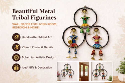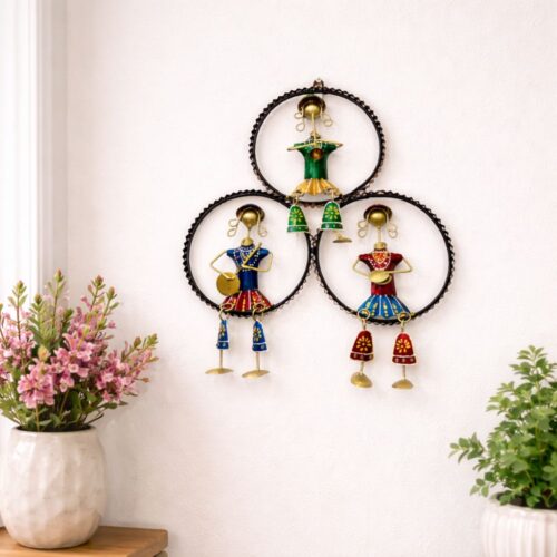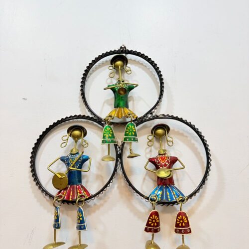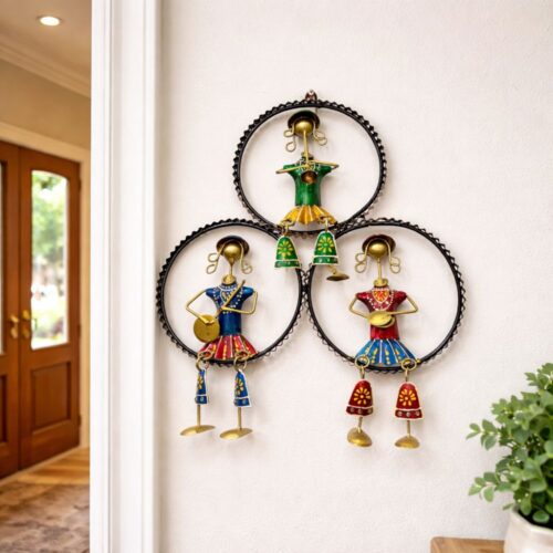 Beautifully handcrafted metal iron musician wall hanging inspired by traditional tribal art, showcasing musicians playing different musical instruments for a rich cultural look.