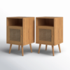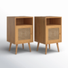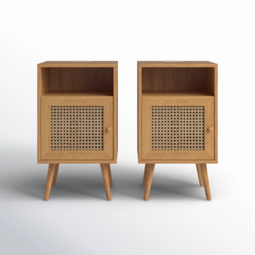 Add a beach-inspired touch to your bedroom ensemble with this nightstand set. Arriving in a set of two, each table is made from solid and engineered wood with a rustic brown finish, and they rest on splayed legs. They feature a hand-knitted rattan door with a perforated design, which opens to a single shelf inside for books and baskets. The top surface has enough room to hold a reading lamp, bedtime stories, and your phone or glasses. Plus, the open shelves accommodate books and accent pieces. Easy to clean with a damp cloth, this nightstand set is fade- and stain-resistant.