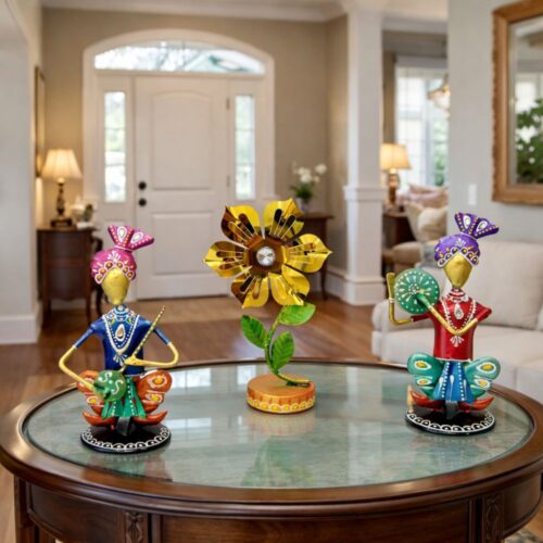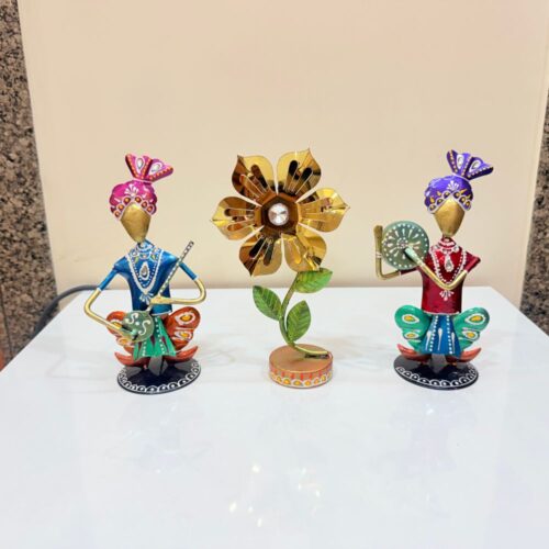 Features colorful Rajasthani musician figurines and decorative metal flowers that add warmth and cultural charm to any space. -