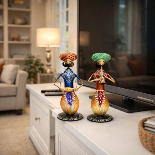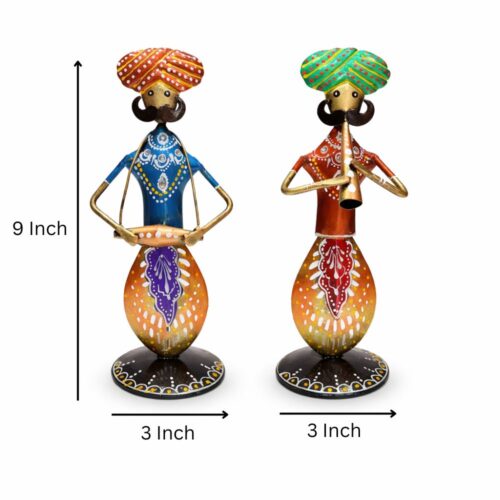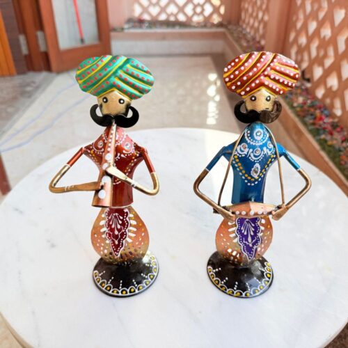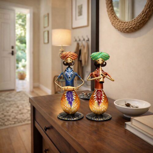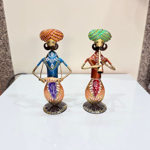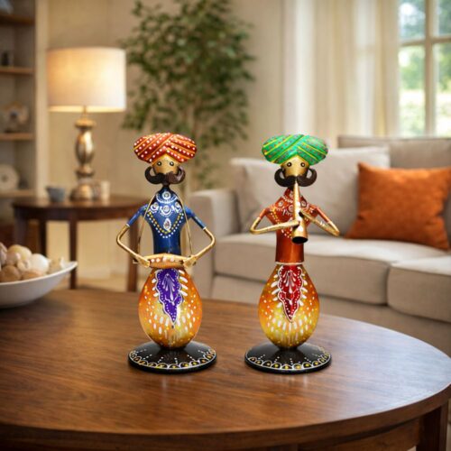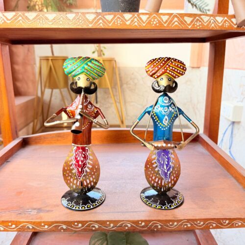Features colorful Rajasthani musician figurines and decorative metal flowers that add warmth and cultural charm to any space.