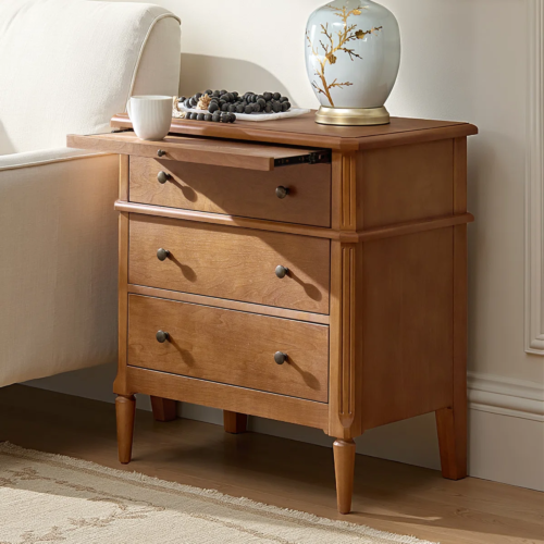 This versatile nightstand blends traditional elegance with transitional charm, offering both beauty and functionality. The top drawer features a hidden compartment for added privacy, perfect for storing valuables discreetly. A convenient pull-out tray provides extra surface space for nighttime essentials like books or beverages. At the back, an integrated power outlet ensures easy access to charging for phones and other electronics. Crafted with sturdy solid wood legs, the piece is built to last. The nightstand’s classic carved knife-style detailing adds a touch of sophistication, making it a standout in any bedroom setting. Its harmonious blend of traditional and transitional styles ensures it complements a wide range of interiors—suitable for those who appreciate timeless design with practical touches. Ideal for adding both style and smart storage to your sleeping space.