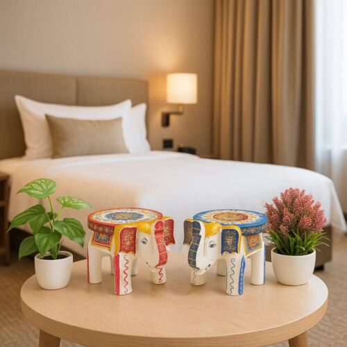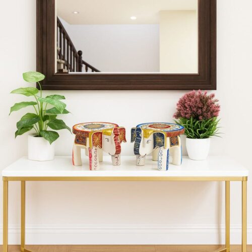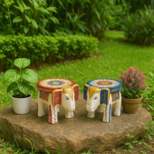 Framing Hub – Handcrafted Emboss Painted Wooden Elephant Stool | Wooden Candle Holder | Colorful Decorative Showpiece Side Table for Home, Office, Living Room or Bedroom Decor (Set of 2).